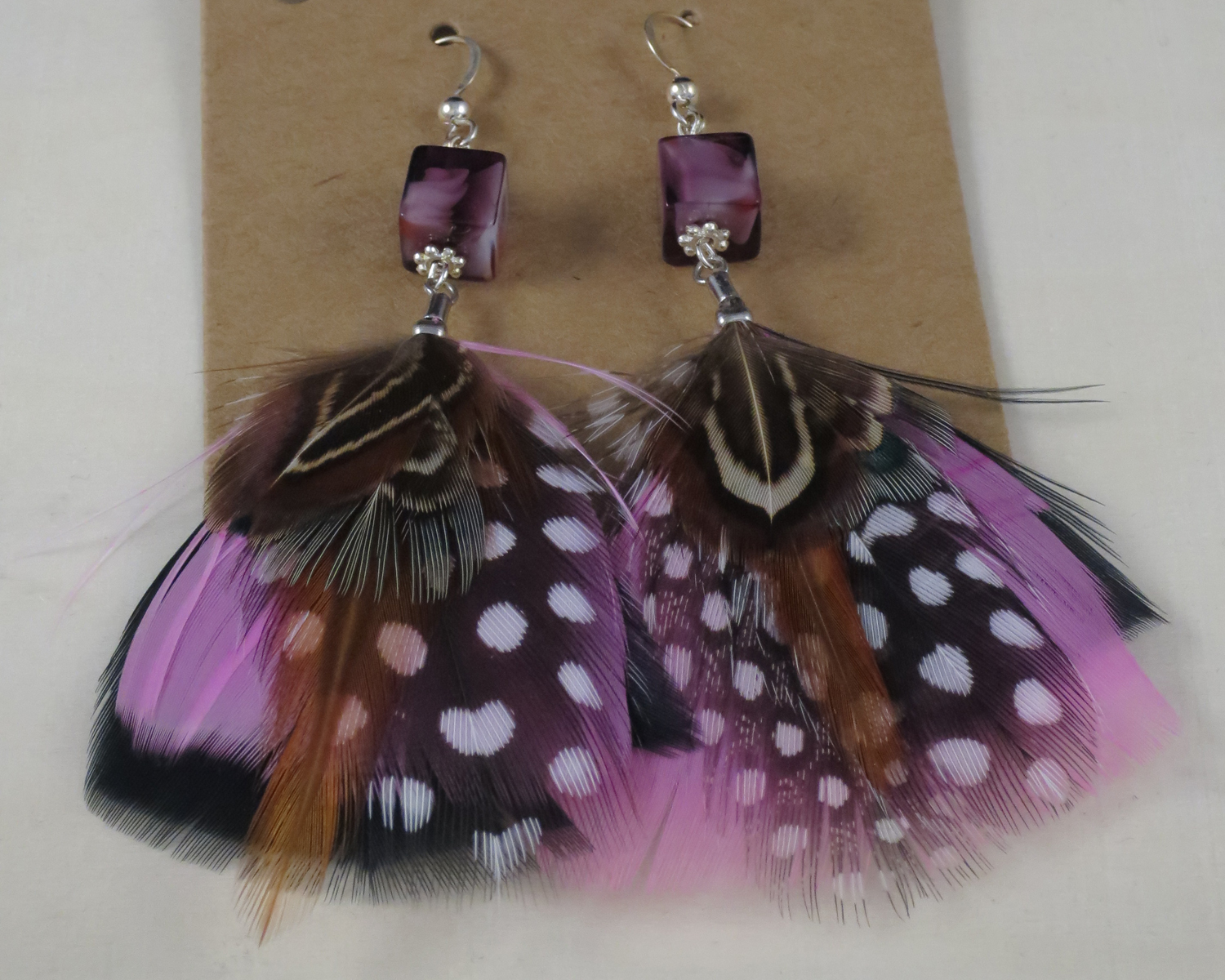 Boucles d'oreilles à plumes. création unique fait de plumes naturelles, de pierres et de perles. Peut se séparées en deux boucles d'oreilles.